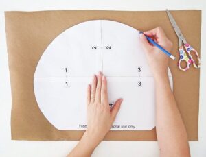 Comece baixando o template (link abaixo) e monte-o. É muito fácil. Você tem dois modelos de folhas diferentes, cada uma composta por 4 folhas. Corte em linhas retas e prenda as folhas com fita adesiva. Coloque as setas numeradas frente a frente.
